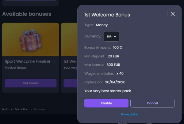 | 1e storting: 100% tot 300 EUR | Min. storting 20 EUR | 40x bonusbedrag |